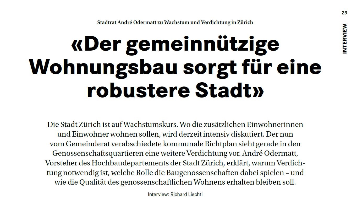 André Odermatt, Vorsteher Hochbaudepartement Stadt Zürich sprach mit der Zeitschrift «Wohnen». Unsere Geschäftsführerin Gabriele Burn mit einem Kurzkommentar.