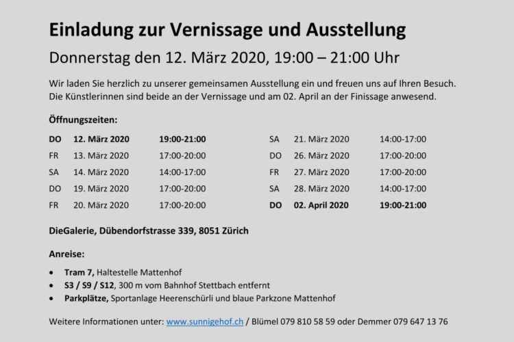 Am 12. April 2020 organisieren die Künstlerinnen Helena Blümel und Ursula Demmer die Vernissage Ihrer Ausstellung in DieGalerie an der Dübendorferstrasse 333 in Zürich.